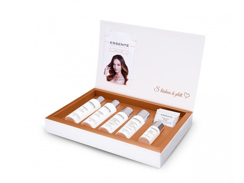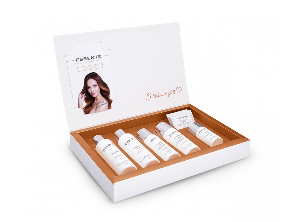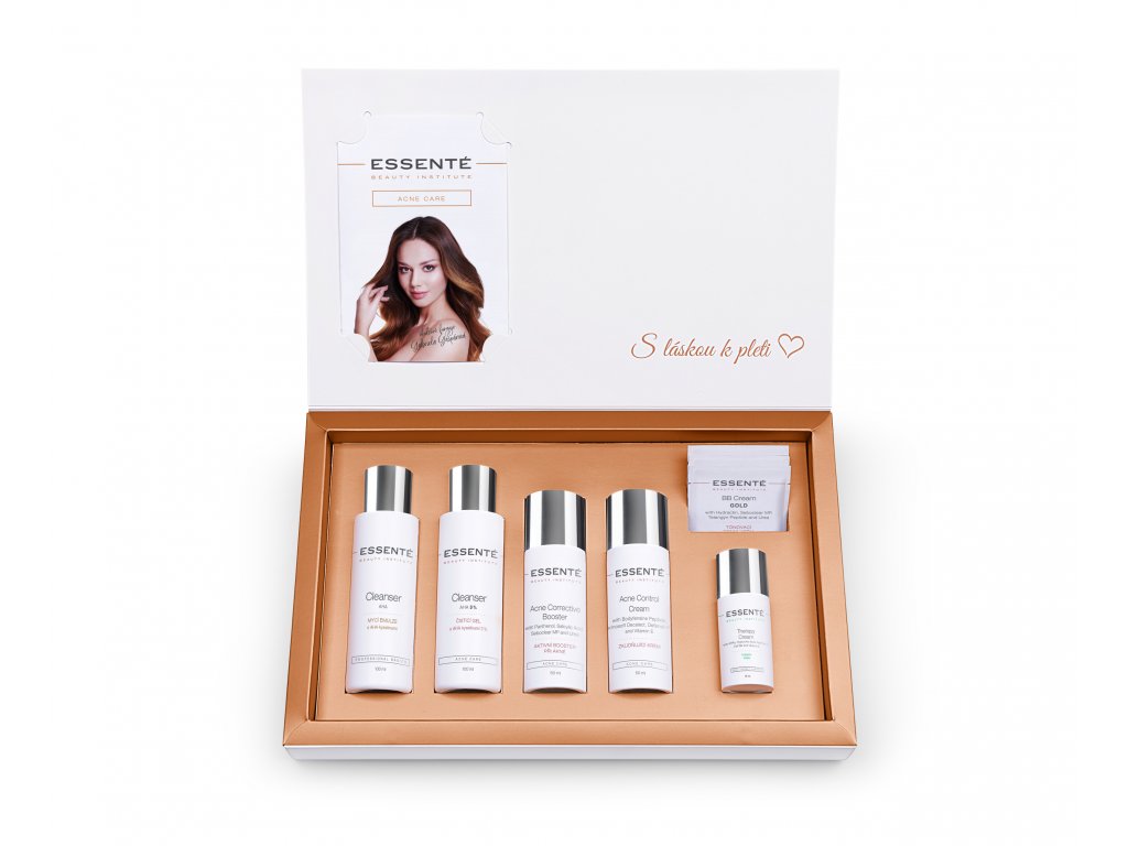 Vysoce účinná sada přípravků pro intenzivní péči při akné rozšířená o Čisticí gel s AHA kyselinami 3 %, který je určen k čištění pleti při akutní fázi akné. Přípravky působí proti bakteriím rodu Propionibacterium Acnes, problematické oblasti ihned zklidní a pomohou s obnovou běžných funkcí pokožky. Sada je vhodná pro problematickou, aknózní pleť. Její součástí je dárek Essenté Therapy krém v hodnotě 520 Kč a testery.