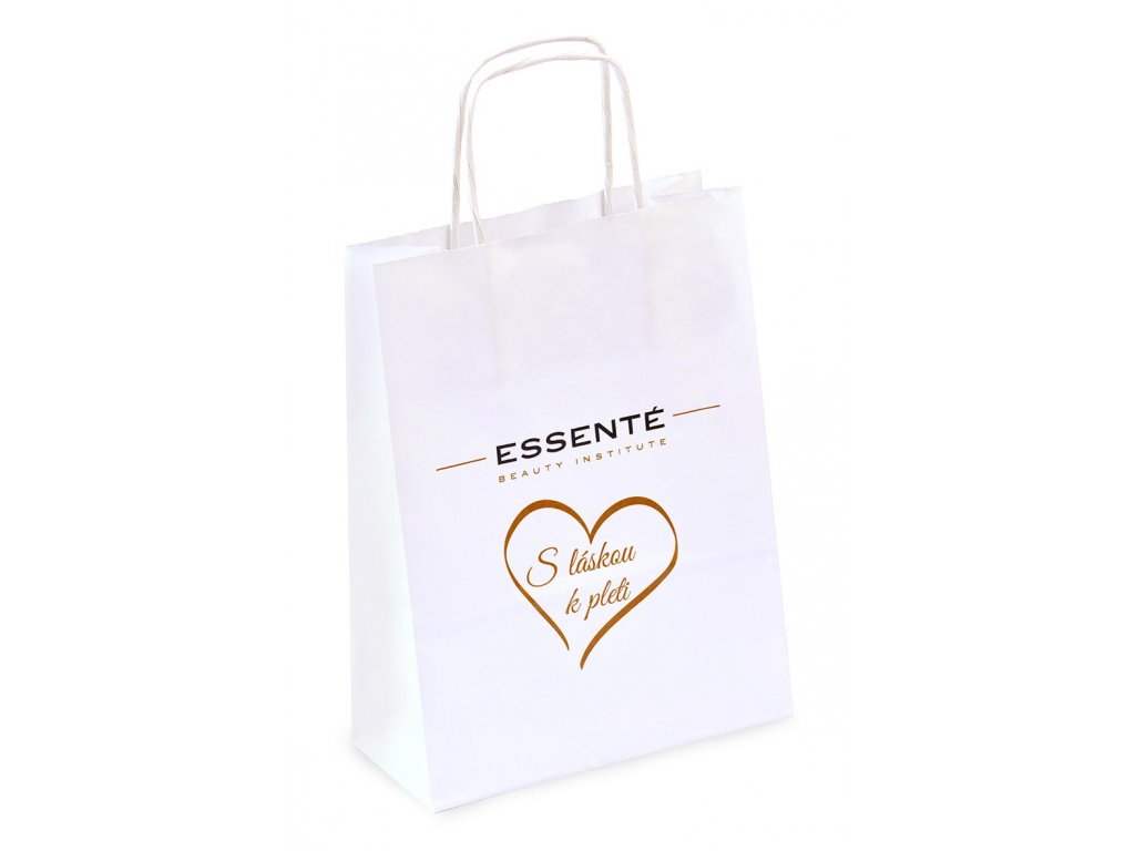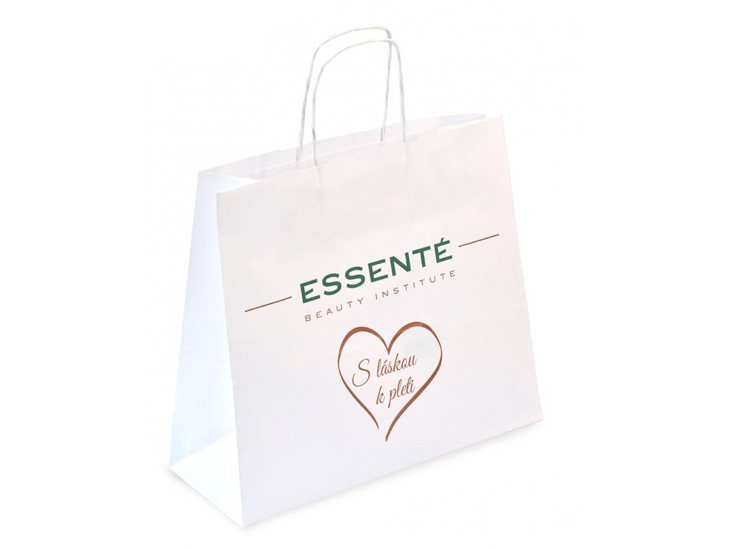 Essenté papierová taška biela s krúteným uchom. Je ideálny na väčšie darčeky a nákupy. Svojím rozmerom je tiež vhodná pre dokumenty A4.